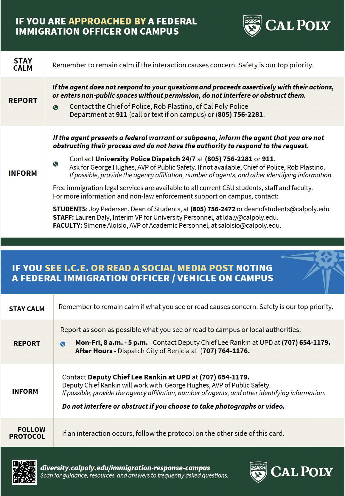- Cal Poly does not engage with federal immigration enforcement without judicial warrants.